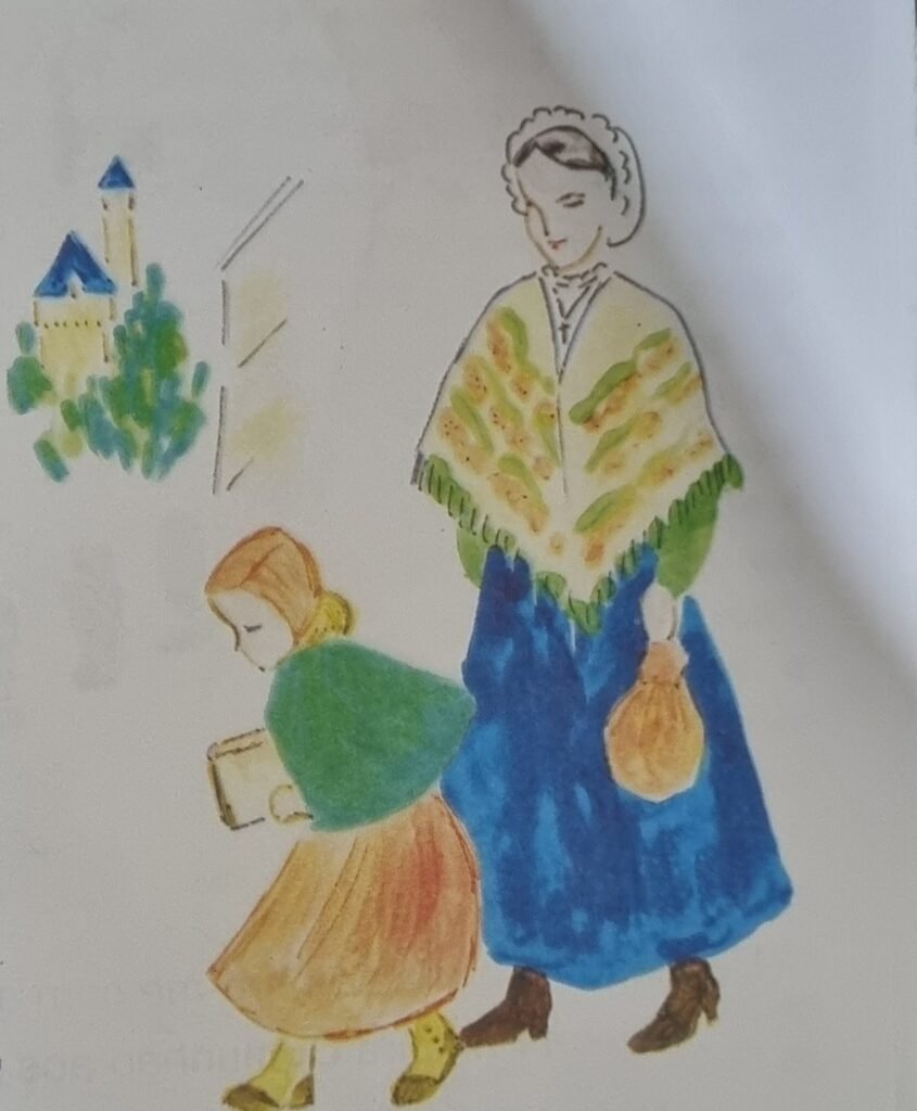 Quando eu era criança, todas as meninas usavam botinhas e andavam sempre com meias. Como eu estava sendo preguiçosa em tricotar, mamãe escondeu minhas meias.De manhã cedo, precisei ir à escola meias. Foi muito difícil pra mim. Parecia que todos os conhecidos me olhavam. A uma dessas pessoas eu disse: “Mamãe já não tem meias para me dar e eu não sei fazer tricô”.