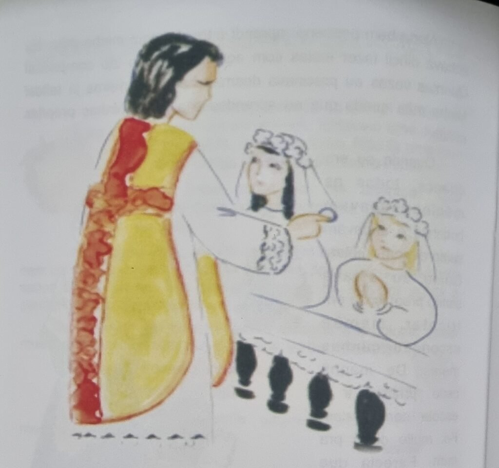 Uma vez ganhei um vestido muito bonito de meu padrinho que chegara de Paris. Ao vestí-lo para passear, fiquei um bom tempo me olhando no espelho e saí toda vaidosa. Minha mãe me chamou antes e me disse: